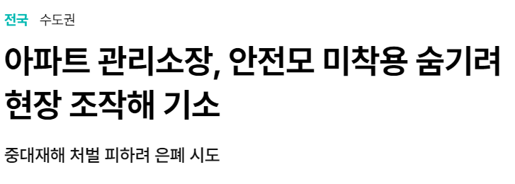 2022년 7월, 양주시의 한 아파트에서 배관 점검 중 사다리가 부러져 근로자가 추락했습니다. 관리소장은 과실을 감추기 위해 안전모에 피를 묻혀 현장에 둔 것이 밝혀졌습니다. 2024년 8월 20일, 대표는 징역 8개월 (집유 2년), 관리소장은 징역 10개월을 선고받았습니다.