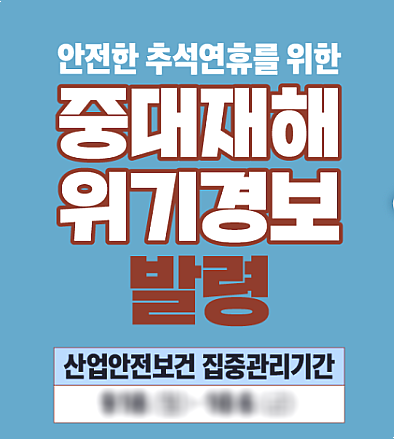 추석 뿐 아니라 설날 등 긴 연휴 전후 기간에는 급한 마무리 작업, 기계 장비의 가동중지 또는 재가동, 관리감독자 또는 안전관리자의 휴가 등의 이유로 사고 및 부상 발생 위험성이 높다고 합니다.