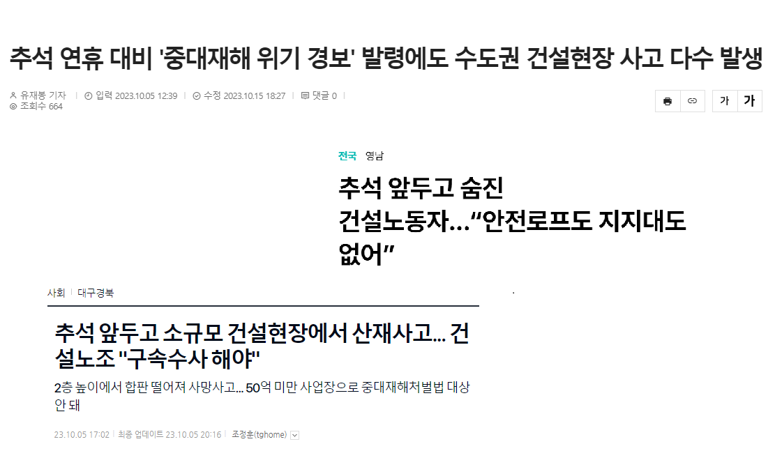 지난해 추석 연휴 직전에는 후진하던 굴착기에 깔리거나, 아파트 보수 작업을 준비하던 근로자가 추락하여 사망하는 사고가 있었습니다.