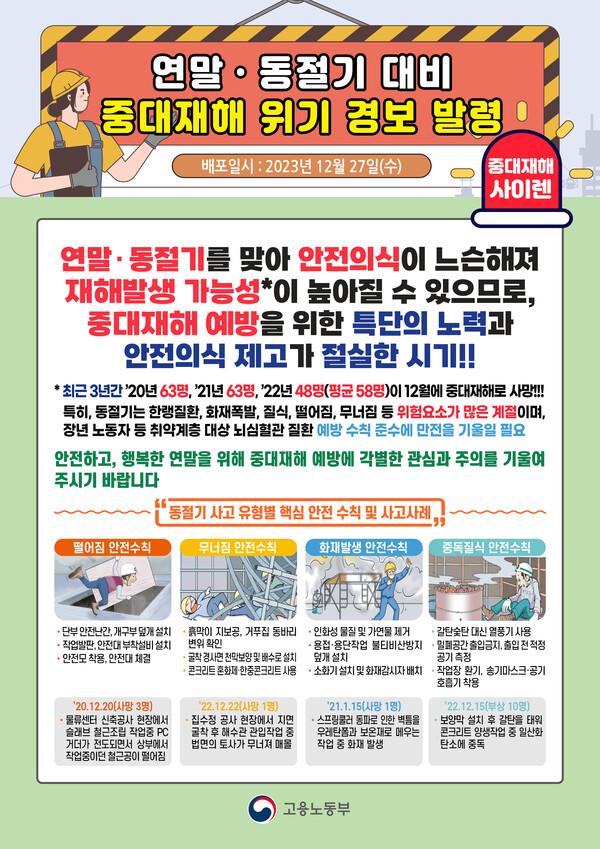고용노동부는 작년 12월 27일 연말·동절기 대비 중대재해 위기 경보를 발령한 바 있습니다. 2023년 12월 22일 단 하루 만에 전국에서 8명의 근로자가 숨졌기 때문입니다.