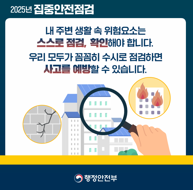 행정안전부에서는 4월 14일 월요일부터 6월 13일 금요일까지 중앙부처, 지방자치단체, 공공기관, 국민이 함께하는 '2025 집중안전점검'을 실시한다고 밝혔는데요.