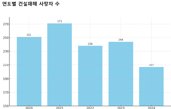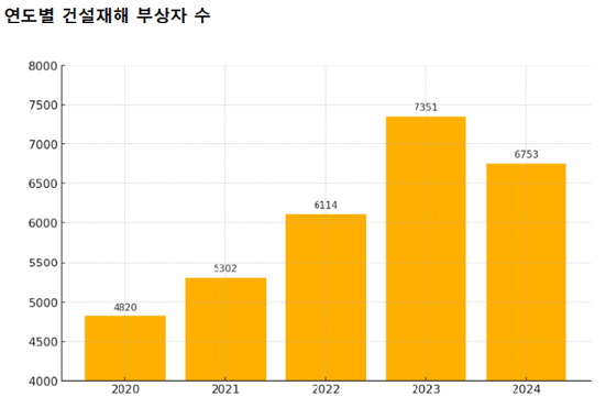 국토교통위원회 자료에 따르면 최근 5년간 건설현장에서 사망한 인원은 총 1,211명, 부상자는 30,340명에 달합니다.