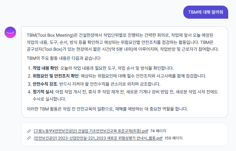 TBM에 관련하여 궁금한 점이 있다면 AI 세이프 챗봇에게 물어보세요.