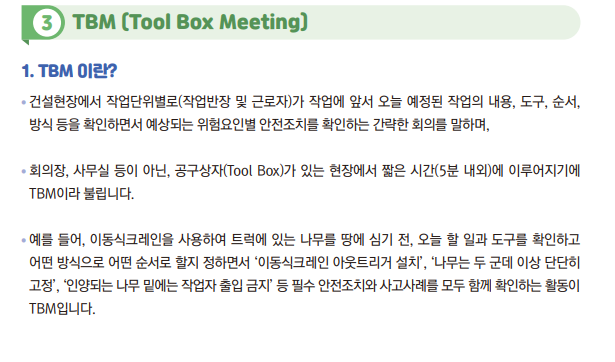 TBM(Tool Box Meeting)은 작업 전 실시하는 안전점검회의로, 관리감독자를 중심으로 근로자들이 모여 작업 내용을 확인하고, 안전 작업 절차를 의논하는 활동입니다.